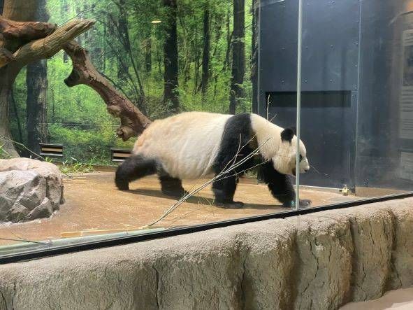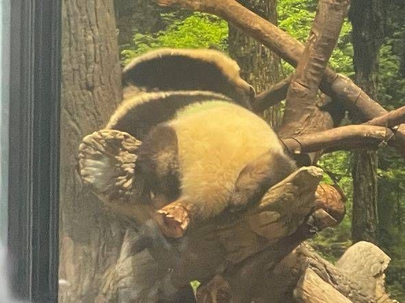 「パンダのもり」は、パンダのふるさとである中国四川省をモデルに、木や岩、水場を再現したエリアで、室外施設は、パンダ舎のようにガラスでおおわれていないため、開放的な雰囲気がある。しかし、残念なことに、観覧の日は、雨天。天候のせいだけではないかもしれないが、パンダ3頭を観れたのは、同エリアにある室内施設であった。パンダのもりの観覧時間は厳格に制限されていて、1人あたりの観覧時間は、1~2分程度。目の前に、双子パンダがいるのはわかったが、木の枝の上でお昼寝中で、顔がほとんどみえない。しかし、ガラス越しにうつる丸いお尻だけみていても、ほほえんでしまうかわいらしさ。癒された。生まれたてのパンダの体重は100~200gの手のひらサイズなので、双子もずいぶん大きくなった。でも、大人パンダと比べればはるかに小さくて、毛並みがふわふわしていて、大きめのぬいぐるみのようだ。パンダは、1歳で30キロ程度のサイズになり、永久歯が生えそろい、竹が食べられるようになる。その後、2歳で約60kg、3歳で90kg程度に、倍々に成長する。