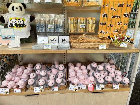 パンダ観覧後に直進したのは、園内の売店である。パンダとハシビロコウの商品が目をひく。パンダ関連商品でおもしろいのが、赤ちゃんパンダのぬいぐるみ。生まれてまもない、シャンシャン、シャオシャオ、レイレイの実際の体重と同じ重さのぬいぐるみが販売されている。